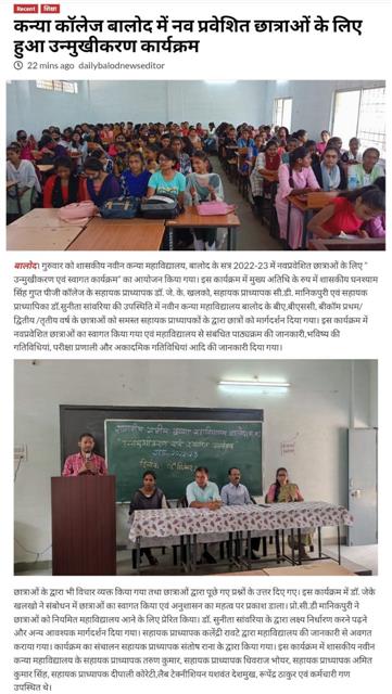 कन्या कॉलेज बालोद में नव प्रवेशित छात्राओं के लिए हुआ उन्मुखीकरण कार्यक्रम
